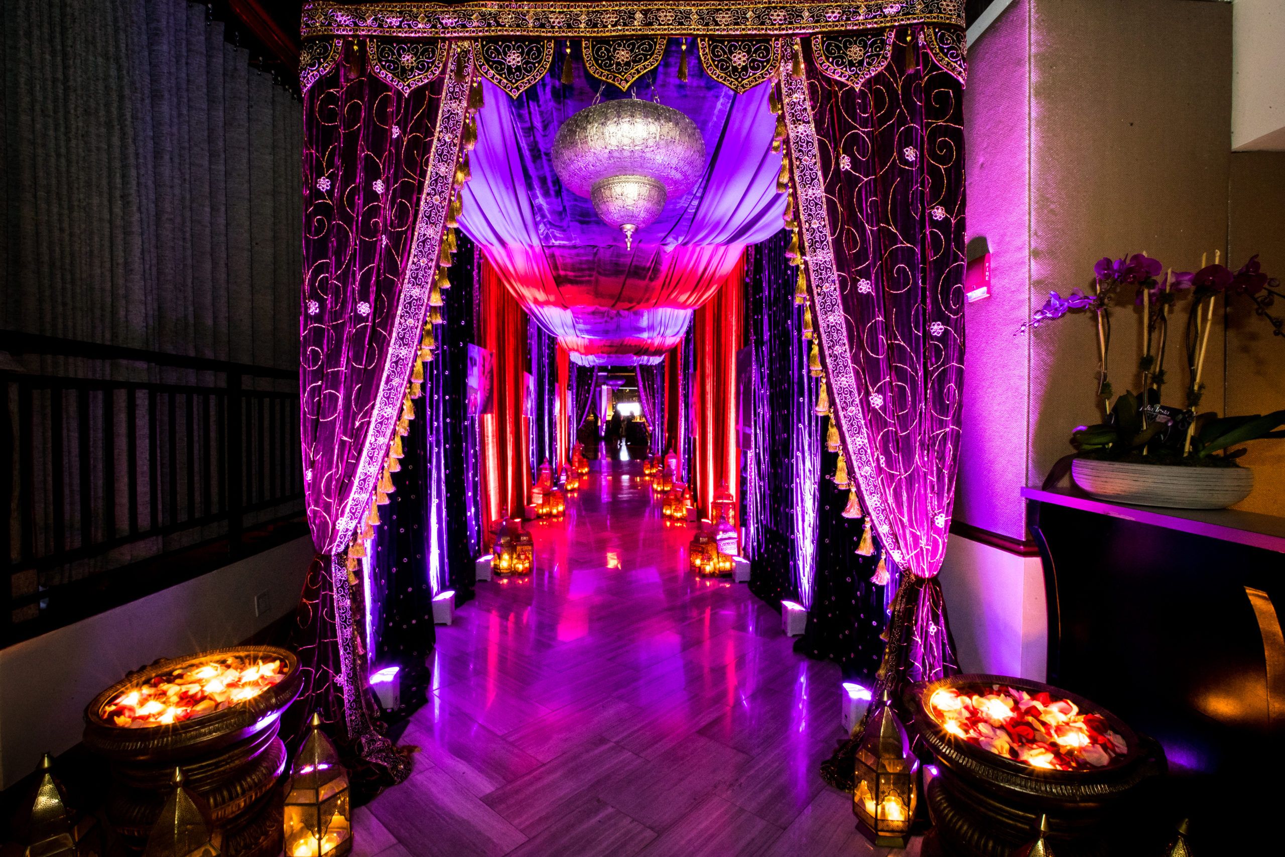 See how Wish Upon a Wedding’s “Written in the Stars” gala created a celestial ambiance with dramatic blue and purple lighting as well as glittering table linen.