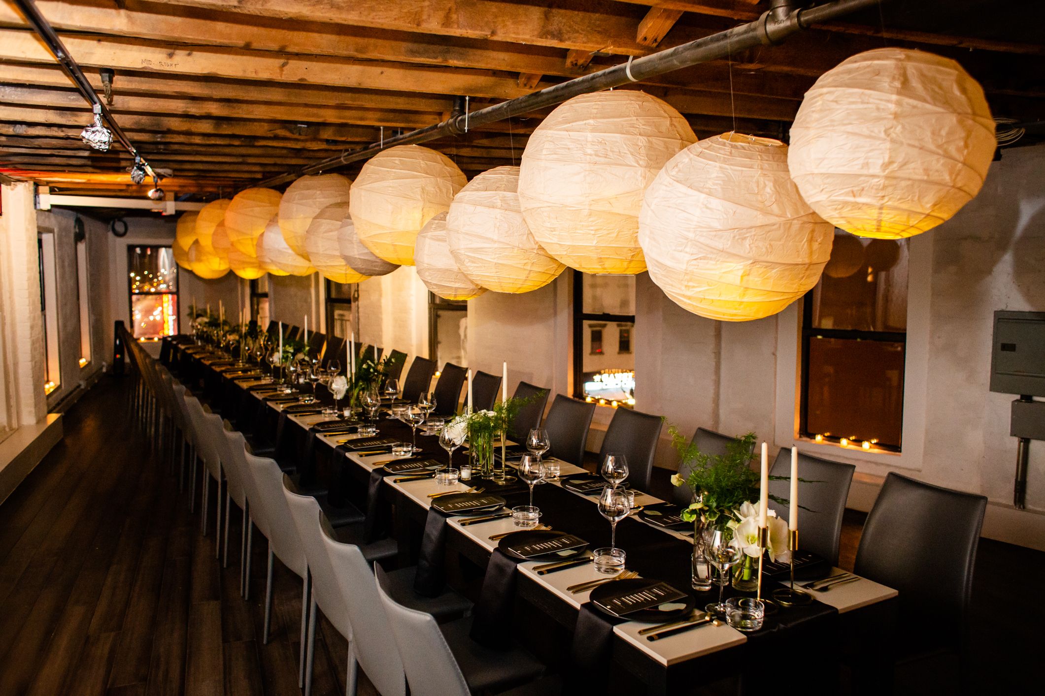 See how the Devonshire Ball Room was transformed from an elegant reception space to a trendy disco and dim sum-themed party with gold ceiling installations, luxe velvet seating, and “floating” disco ball centerpieces.