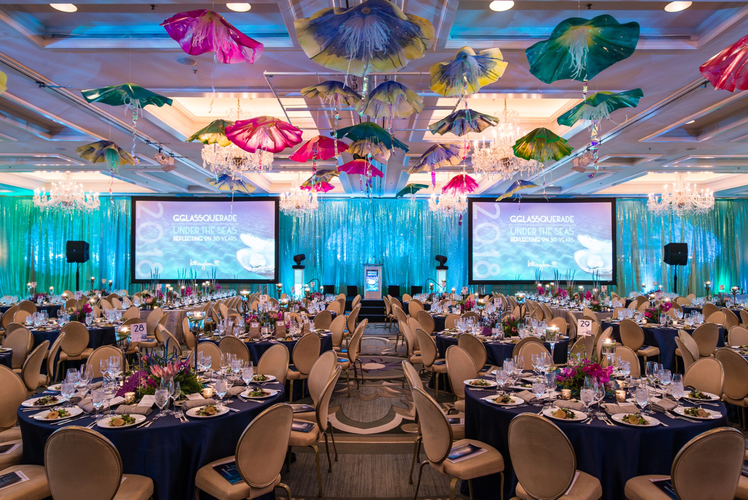 See how this “Under the Sea” non-profit anniversary gala brought glamorous ocean vibes to the Grand Ballroom with shimmering curtains, dreamy uplighting, and lush ceiling décor.