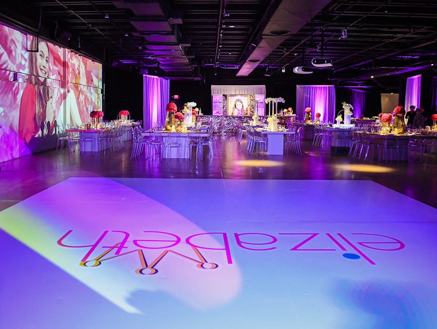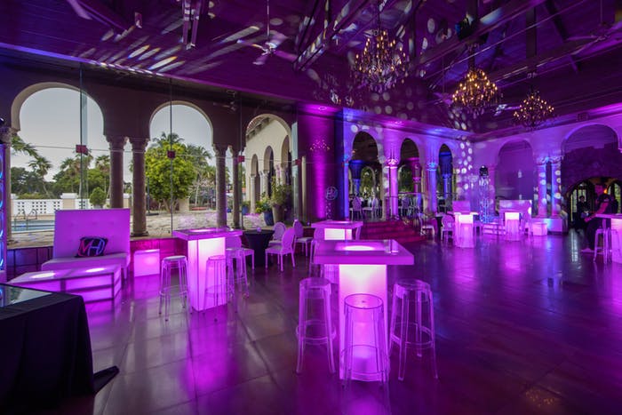 We love how Huppert’s extreme sweet 16 party lit the chic space in neon purple that went from the stunning arched entrance to the custom bar and sunken, projection-mapped dance floor.