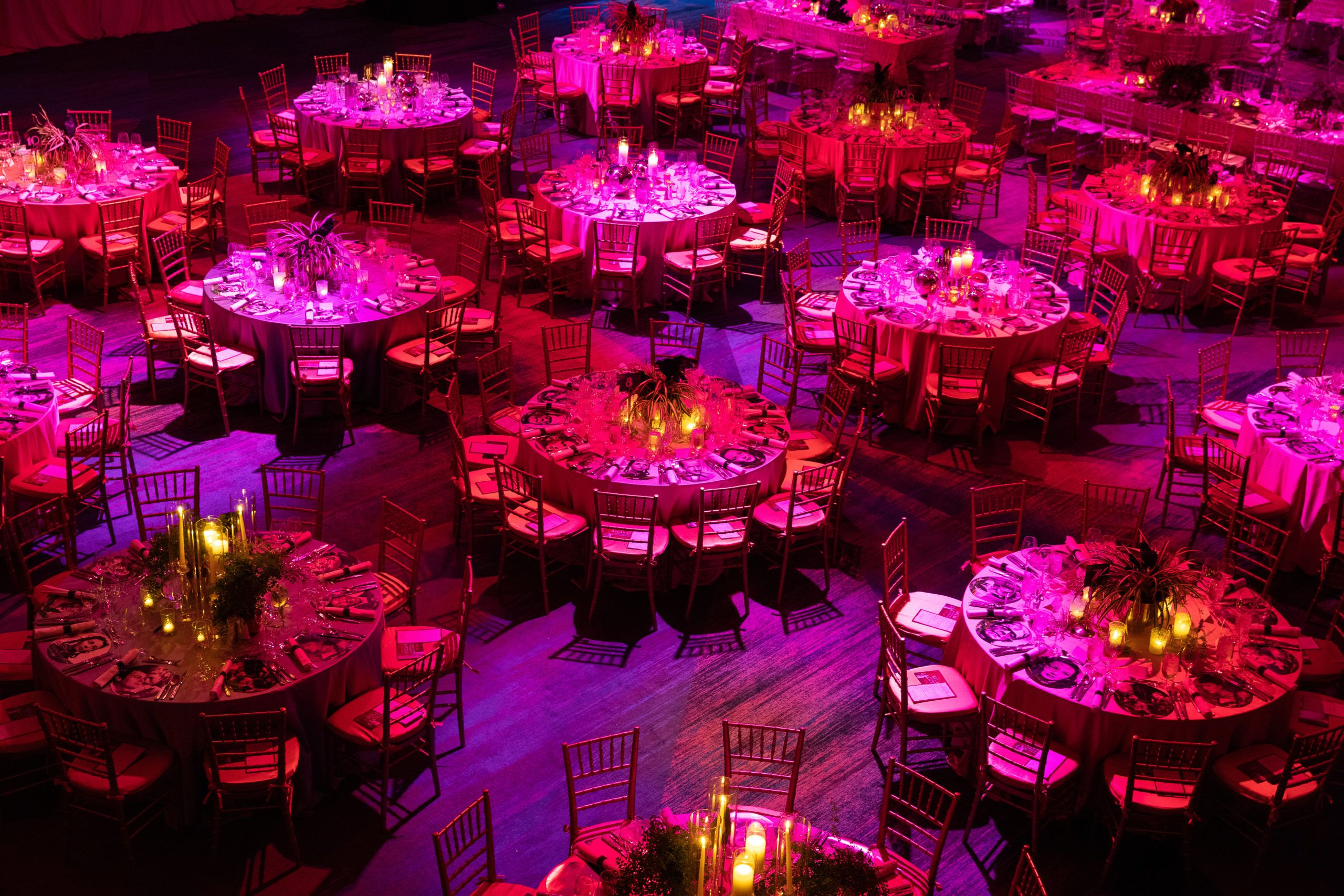 Exclusive event spaces are specifically designed to host celebrations. As such, they tend to be more versatile and transformable. Think of the space as a blank canvas. We love how this corporate holiday party at Venue SIX10 feels like six parties in one. Ever-shifting uplighting by BlackOak Technical Productions casts the celebration in a range of bold hues from one minute to the next. Click “See More Photos,” and see which color you like best.